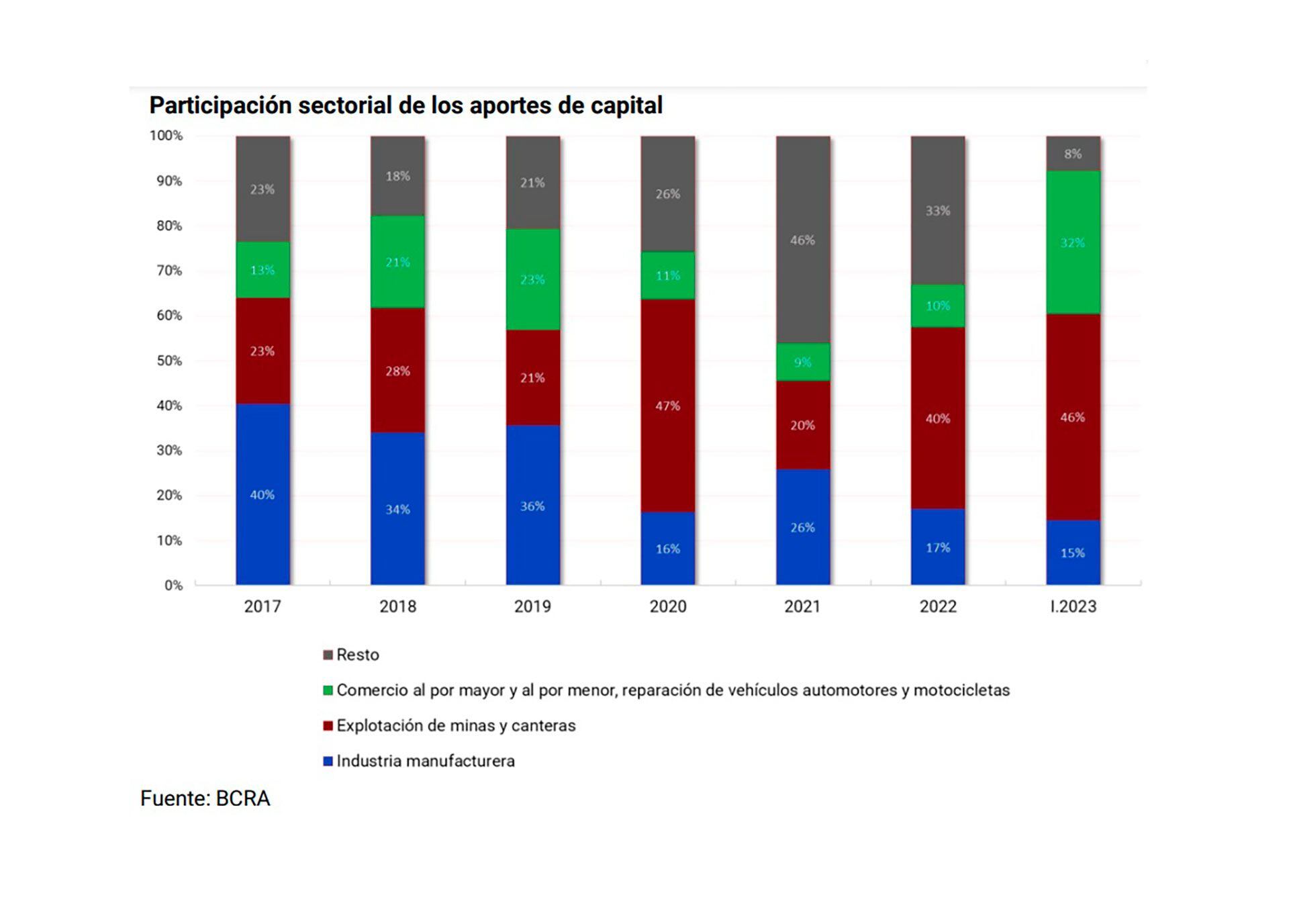 En el primer trimestre de 2023 el 92% de los aportes de capital tuvieron como destino tres sectores: “Explotación de minas y canteras”, con el 46% del total; “Comercio al por mayor y al por menor, reparación de vehículos automotores y motocicletas”, con el 32%; e “Industria manufacturera”, que explicó el 15% del total de aportes.