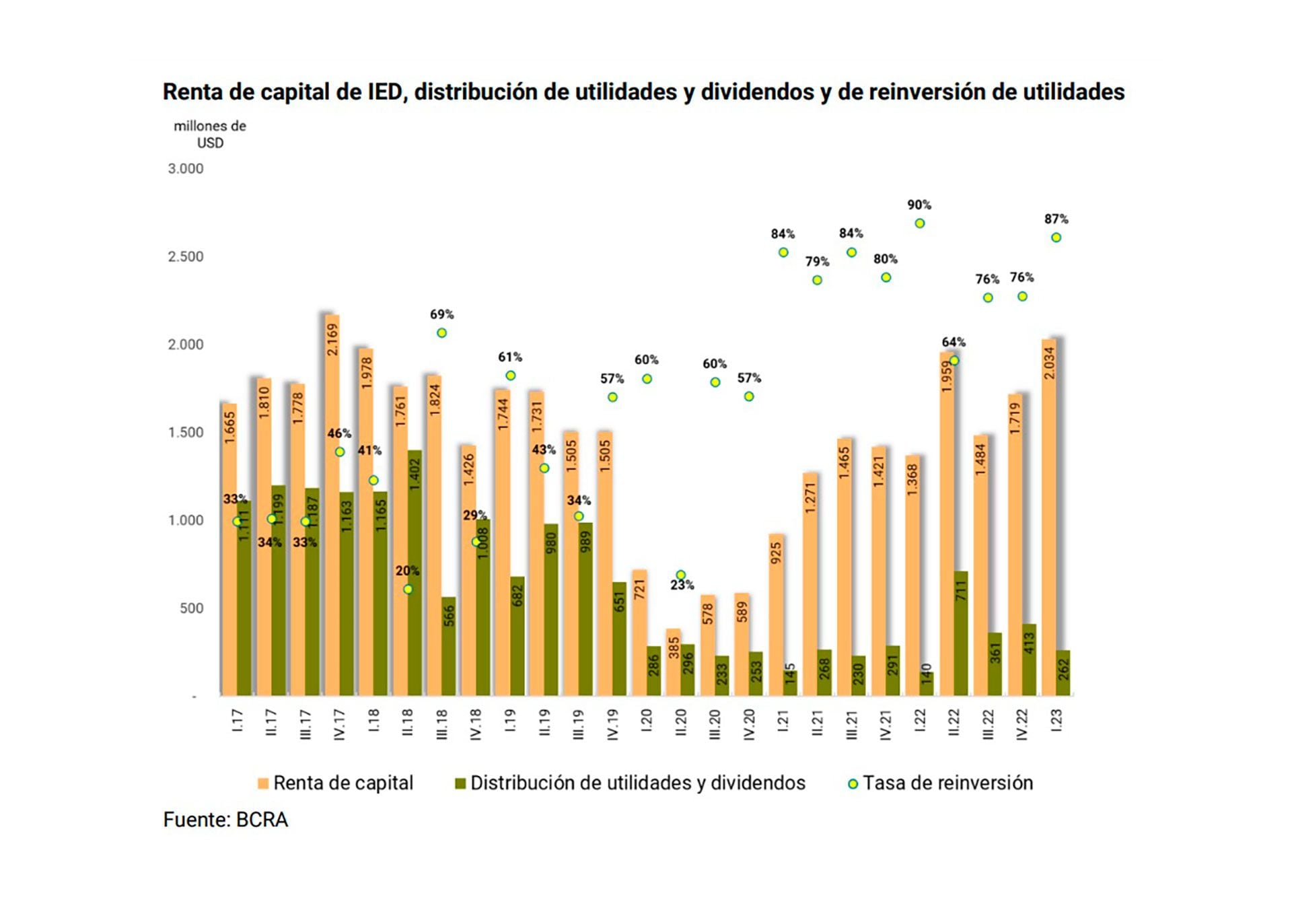 Con estos datos, la proporción de la renta que se reinvierte en la empresa de inversión directa fue del 87% en el primer trimestre de 2023, lo que representó una caída interanual de 3 puntos porcentuales (p.p.).