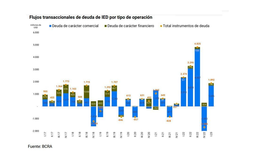 En el primer trimestre de 2023 los flujos transaccionales de deuda resultaron en ingresos netos por USD 1.892 millones, impulsados principalmente por el aumento de la deuda por importaciones de bienes con empresas relacionadas. Esta cifra reflejó un incremento en el trimestre de USD 3.578 millones y una caída interanual de USD 482 millones.
