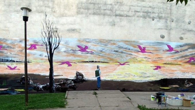 Un mural en medio de la ciudad recrea el encanto del Lago Epecuén y su entorno natural, también el impacto de las ruinas de la ex Villa turística.